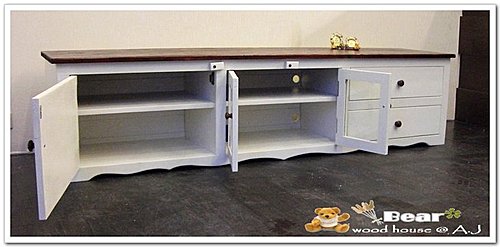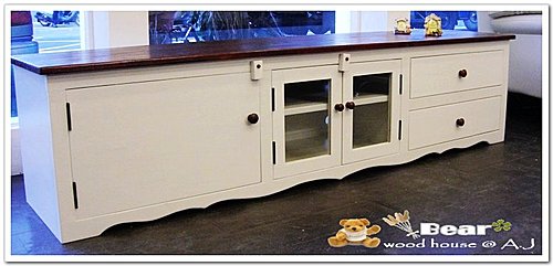 雙色電視櫃,下面採用鄉村白,上面是柚木+梨花木色系染成,形成強烈的對比。