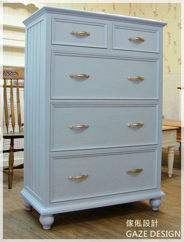 手工實木家具。粉嫩嬰兒藍五斗櫃